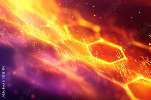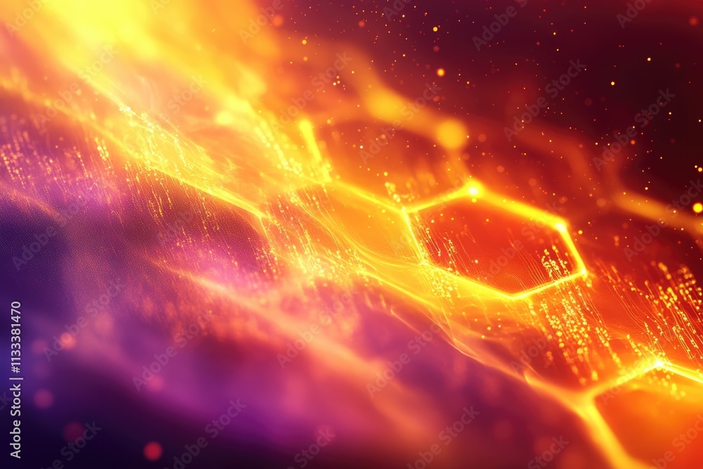 Wall mural abstract fiery orange and purple hexagonal network glowing with digital data streams.