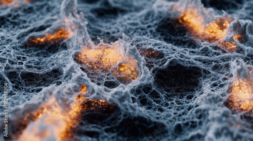The watermark will not be included on Wall mural.: Abstract fiery texture with glowing elements and intricate web-like patterns in dark background