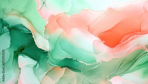 The watermark will not be included on Wall mural.: Abstract fluid art with soft green and coral tones, creating a serene and calming background -