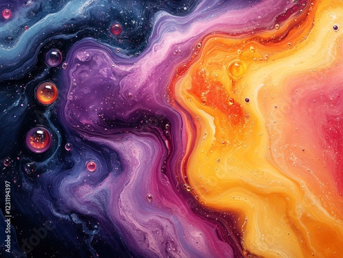 The watermark will not be included on Wall mural.: Abstract fluid art with vibrant colors and bubble-like spheres creating a dynamic and ethereal effec