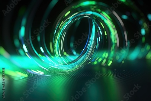 Wall mural abstract futuristic background with green glowing neon moving high speed wave lines and bokeh lights