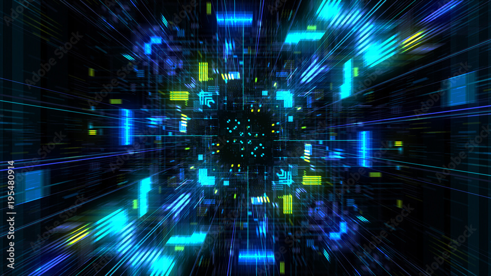 Wall mural abstract futuristic sci fi warp tunnel with particle grid. graphic for data center, server, internet