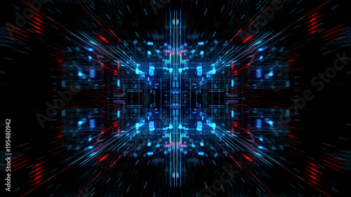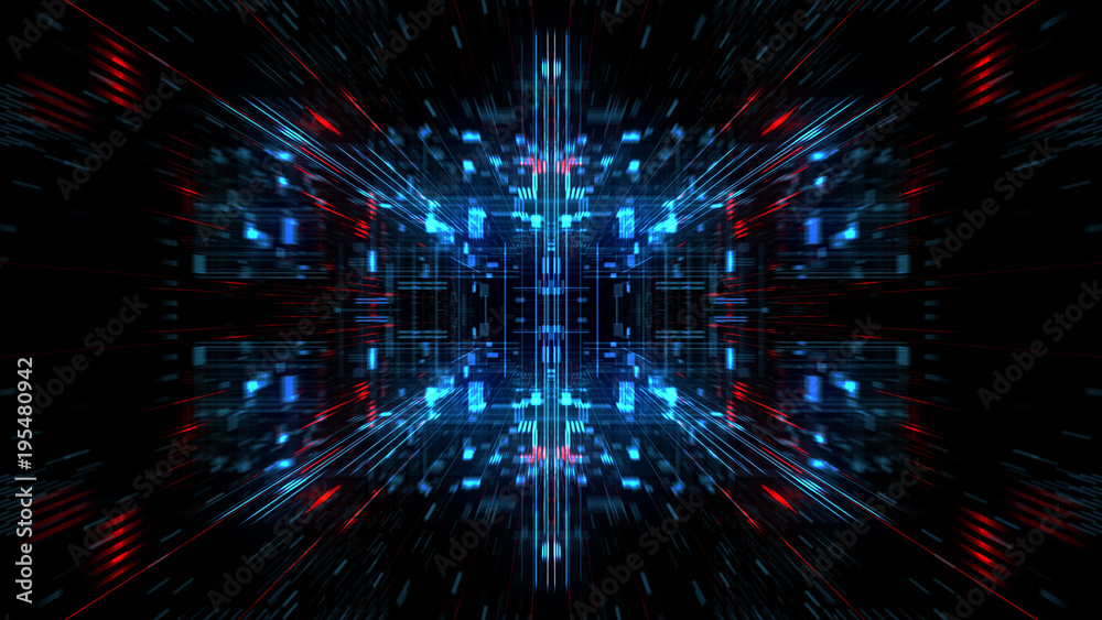 Wall mural abstract futuristic sci fi warp tunnel with particle grid. graphic for data center, server, internet
