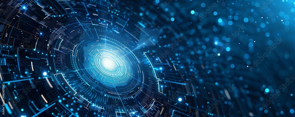 Wall mural : Abstract futuristic technology background with glowing blue lights and digital circuit patterns