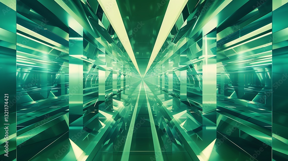 The watermark will not be included on Wall mural.: Abstract futuristic tunnel with reflective surfaces in vibrant green color scheme and sleek geometri