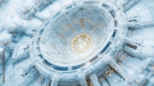 The watermark will not be included on Wall mural.: Abstract futuristic white circular machine with glowing core -