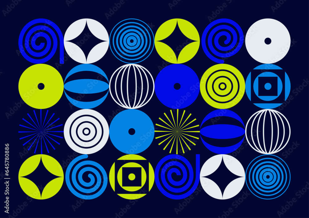 The watermark will not be included on Wall mural.: Abstract geometric background with circles and spirals in a modern brutalist style -
