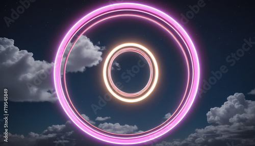 The watermark will not be included on Wall mural.: Abstract geometric background with neon ring and stormy cloud, round frame with copy space in night