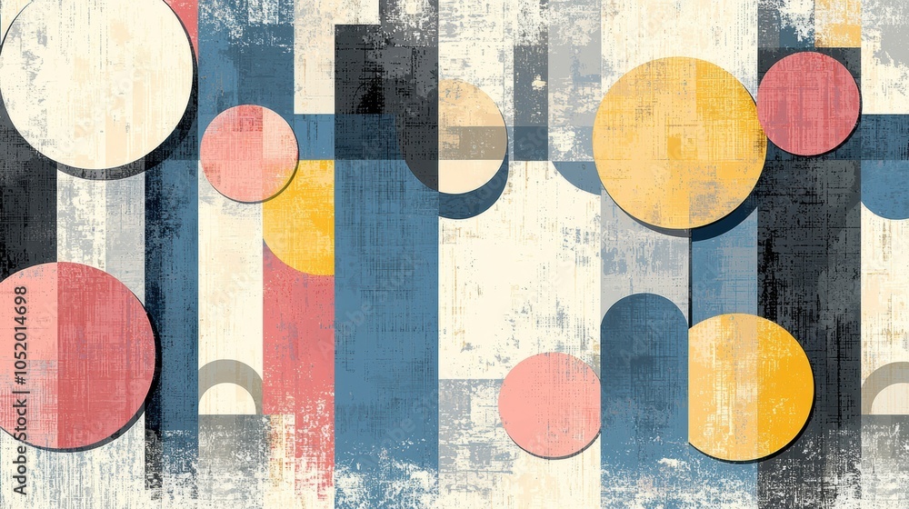 The watermark will not be included on Wall mural.: Abstract geometric composition featuring circles and rectangles in soft pastel colors on a textured