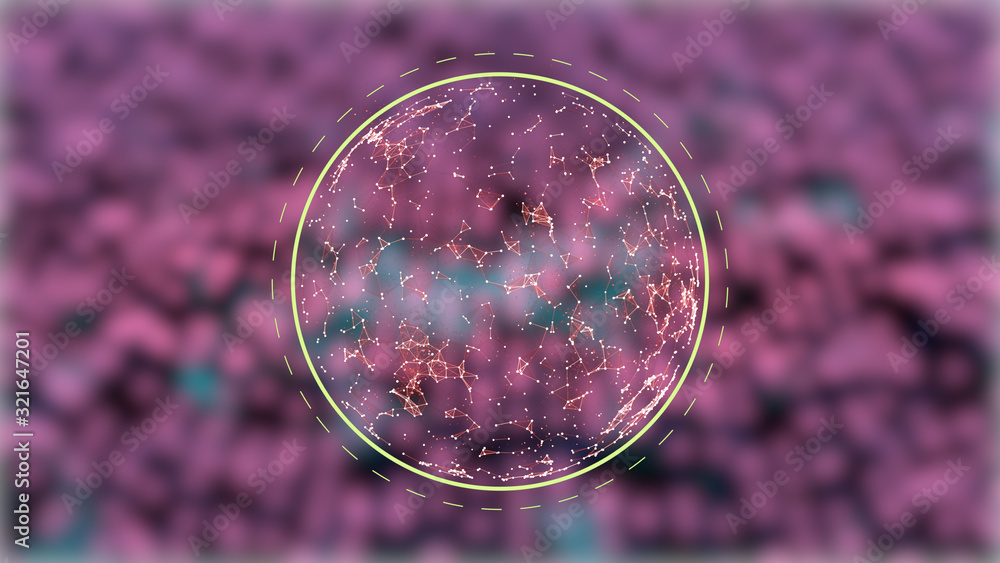 Wall mural abstract globe in triangular network connections flickering on blurred pink dots background.