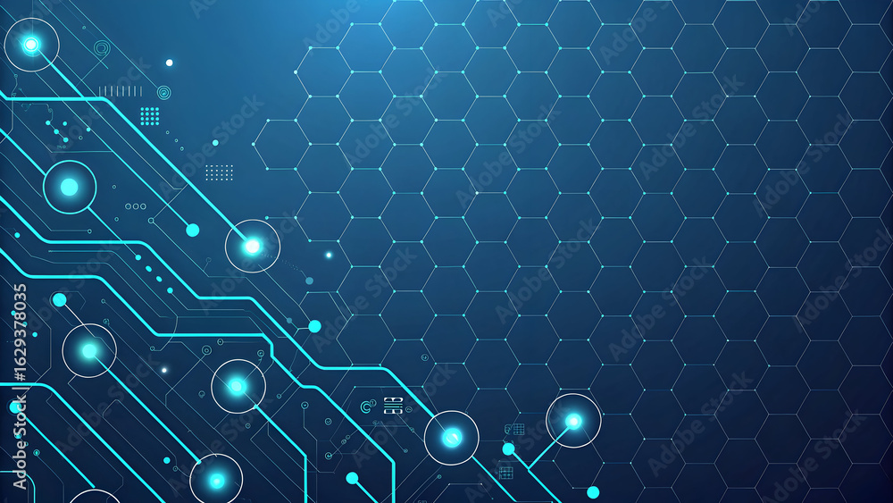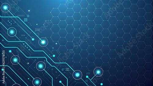 Wall mural : Abstract glowing blue circuit board pathways with digital data streams and futuristic technology bac