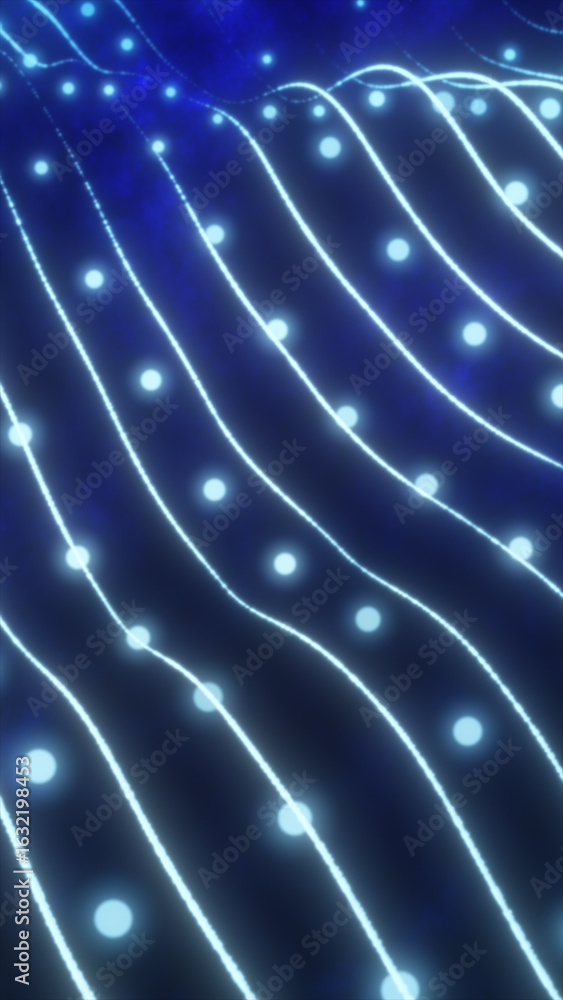 Wall mural abstract glowing blue grid with light nodes flowing in wave-like formation on a dark background