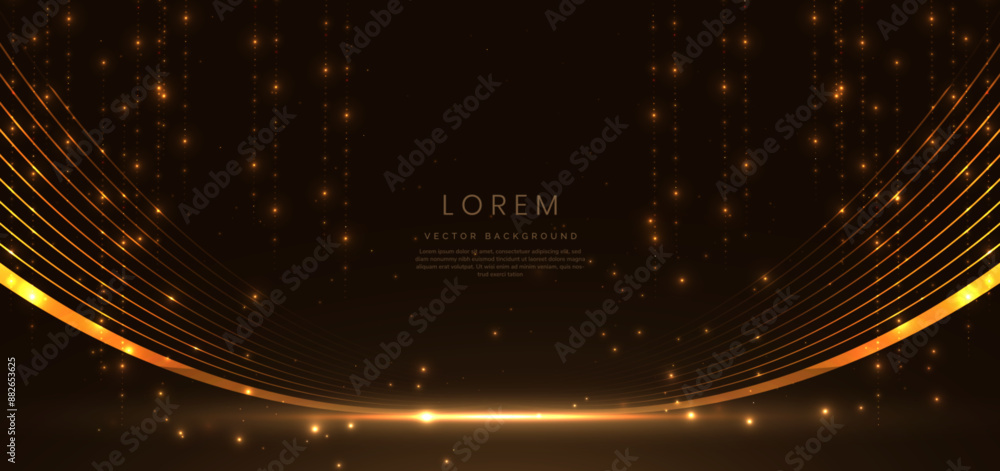 The watermark will not be included on Wall mural.: Abstract glowing gold lighting curve lines on dark background with lighting effect and sparkle with