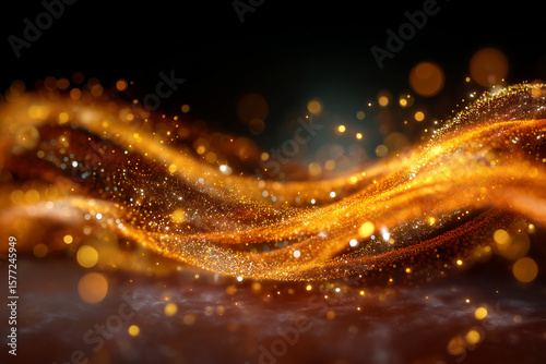Wall mural abstract glowing golden particles flowing in dynamic wave patterns on a dark background with bokeh l