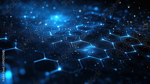 Wall mural abstract glowing hexagonal grid in electric blue, fading into a deep black background for a sci-fi f
