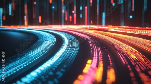 The watermark will not be included on Wall mural.: Abstract glowing light trails curve on dark background, resembling a futuristic digital highway or d