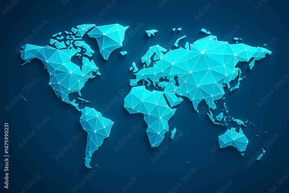Wall mural : Abstract glowing polygonal world map composed of interconnected triangular shapes on a dark blue bac