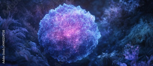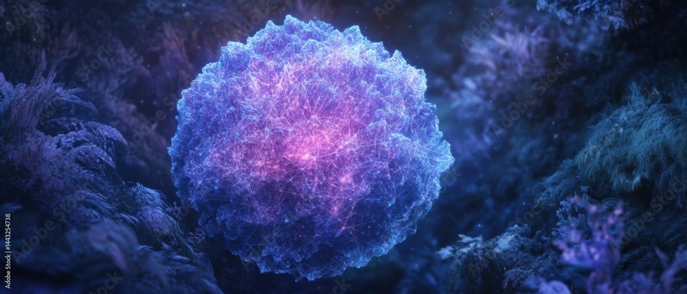 The watermark will not be included on Wall mural.: Abstract glowing sphere with intricate network of lines surrounded by ethereal foliage in a dark blu