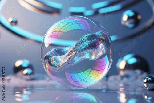 The watermark will not be included on Wall mural.: Abstract glowing sphere with iridescent fluid core and neon reflections on glossy surface, surrounde