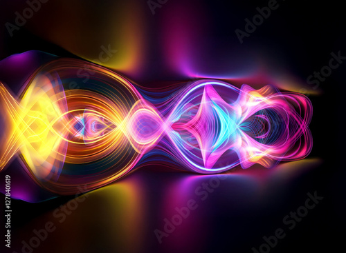 Wall mural : Abstract glowing waves of vibrant colors flow and intertwine against a dark backdrop, creating a mes