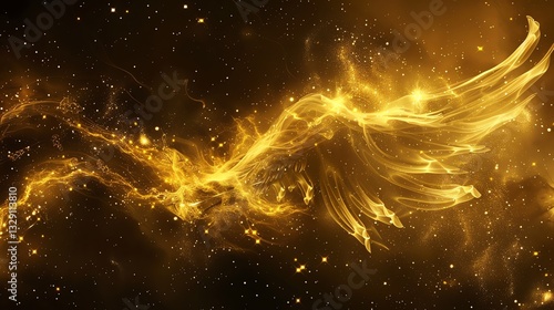 The watermark will not be included on Wall mural.: Abstract gold light in swirling patterns on a black background with tiny gold stars -