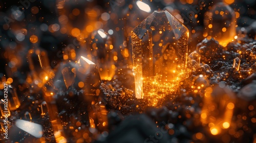Wall mural abstract golden light rays with geometric crystal shapes in 3d rendering