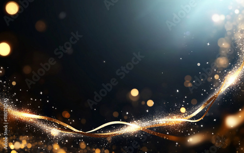 Wall mural : Abstract golden light waves with glowing particles and luminous streaks on dark background creating