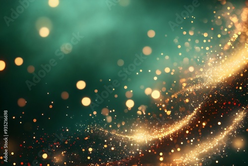 Wall mural abstract golden particles flowing and sparkling on dark green background with copy space for design