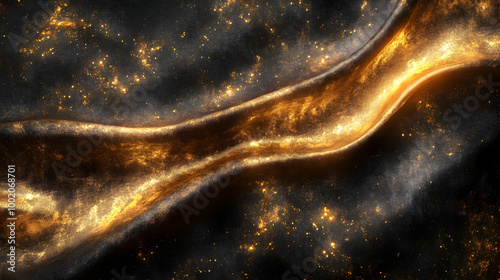The watermark will not be included on Wall mural.: Abstract golden swirl pattern with glowing particles on a dark background, creating a sense of movem