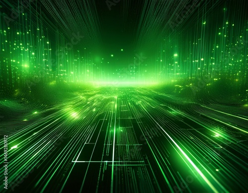 Wall mural : Abstract green digital background with glowing lines and particles perfect for tech themes and futur