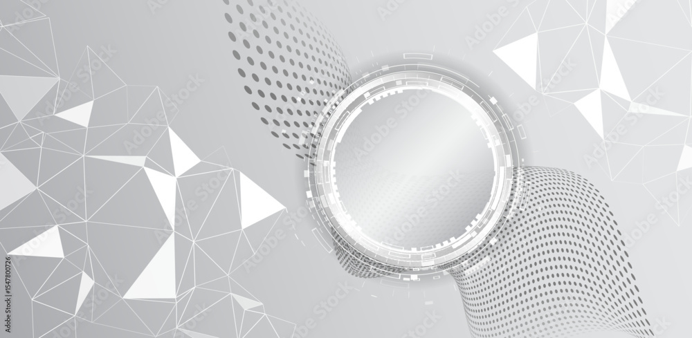 Wall mural abstract grey tech background with futuristic circular interface, dotted wave patterns and polygonal