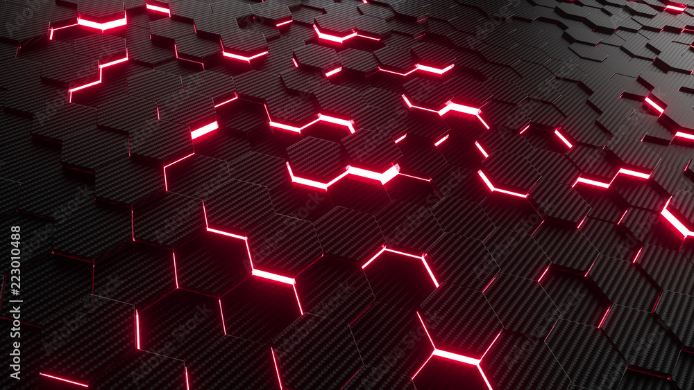Wall mural : Abstract hexagonal geometric background - structure of lots of hexagons of carbon fiber with bright e