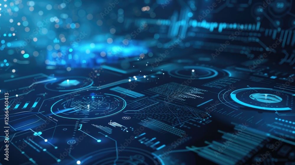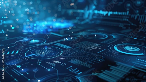 Wall mural abstract high tech blue screen background with circle graphs and diagrams