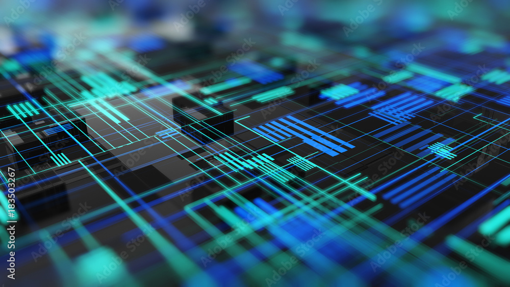 Wall mural abstract high tech digital technology background made of particles and metallic plates.