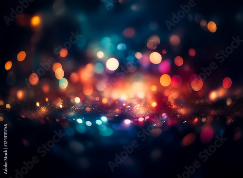 The watermark will not be included on Wall mural.: Abstract image displays a mesmerizing bokeh effect with vibrant, blurry lights against a dark backdr