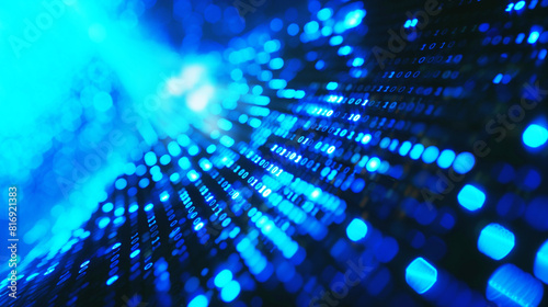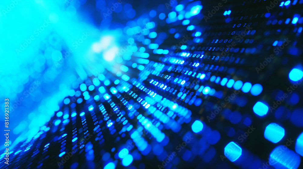 The watermark will not be included on Wall mural.: Abstract image featuring blue binary code and light patterns, symbolizing data flow, technology, and