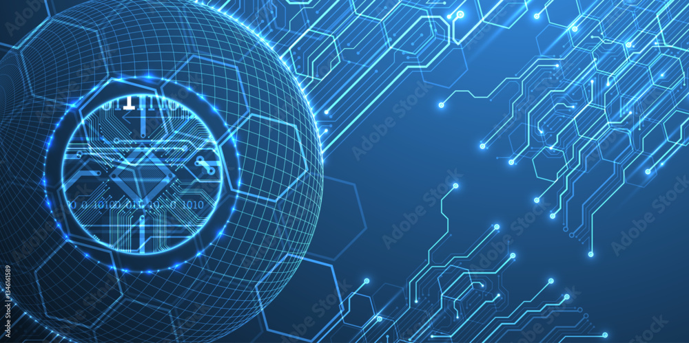 The watermark will not be included on Wall mural.: Abstract image of a computer chip in the middle of a wireframe sphere on a blue gradient - vector