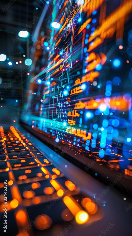 Wall mural : Abstract image of a glowing keyboard with colorful visual data overlays, representing technology, pr