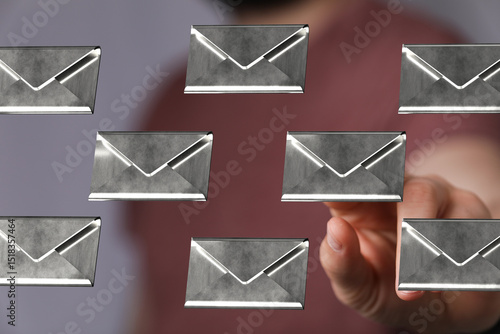 Wall mural : Abstract image of a man interacting with floating metallic email icons, representing digital communi