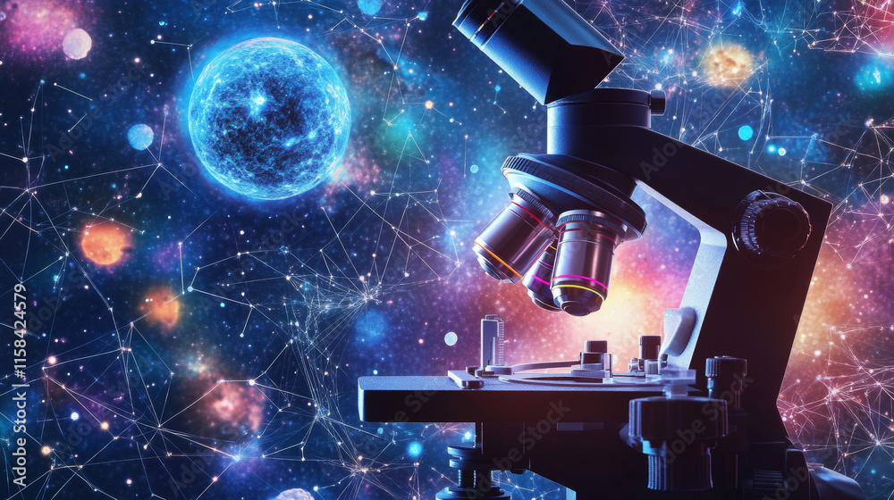 Wall mural abstract image of a microscope in the form of a starry sky or space, consisting of points, lines, an