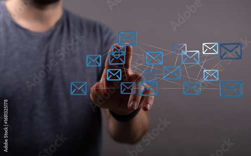Wall mural abstract image of a person interacting with a digital network of email icons, representing communica