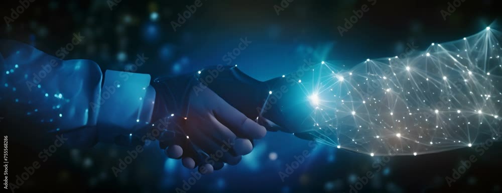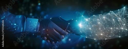 Wall mural : Abstract image of business handshake in glowing blue - low polygon, particle, and triangle style desi