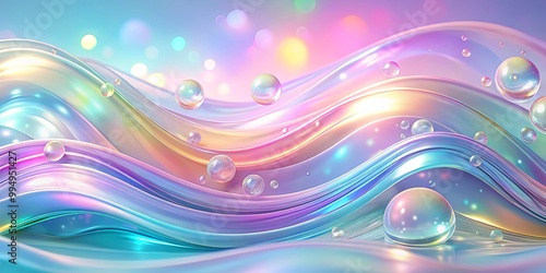 The watermark will not be included on Wall mural.: Abstract iridescent waves with floating spheres, reflecting soft light and creating a mesmerizing dr