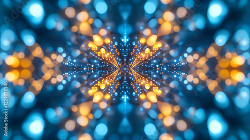Wall mural abstract kaleidoscope pattern with glowing blue and orange light effect creating symmetrical fractal