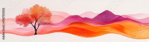Wall mural : Abstract landscape with colorful hills and a tree, soft wave patterns -