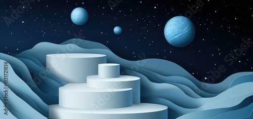 The watermark will not be included on Wall mural.: Abstract landscape with layered forms and celestial bodies in a cosmic setting -