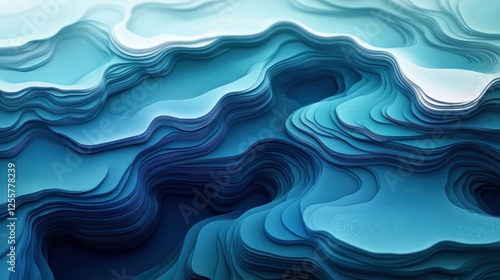 Wall mural : Abstract layered waves in shades of blue, creating a serene depth effect on a white background -
