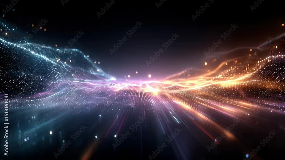 Wall mural : Abstract light waves creating a dynamic flow of colors and particles in a dark background environmen