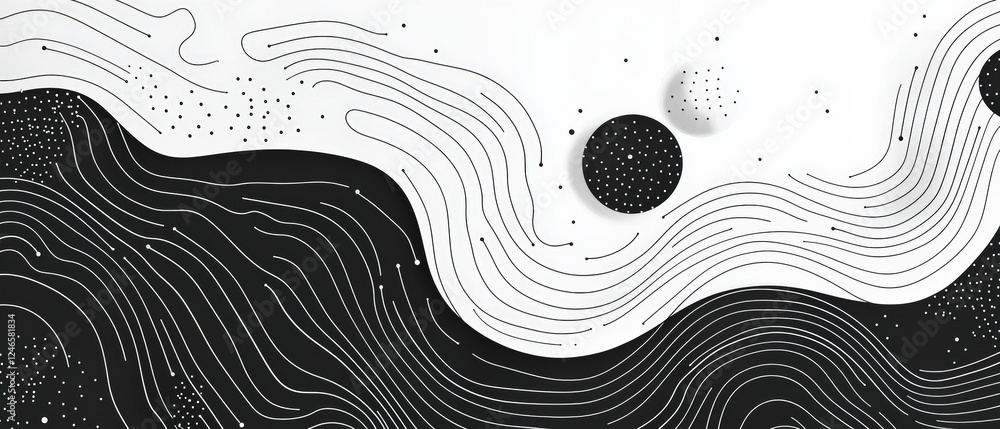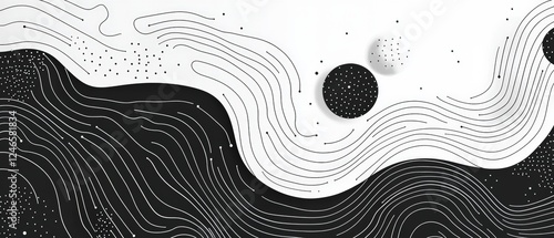The watermark will not be included on Wall mural.: Abstract maze in black and white with flowing lines and dots on a minimalist background