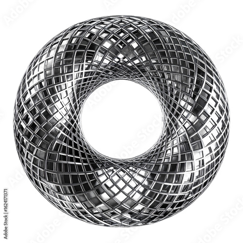 Wall mural : Abstract metallic geometric torus shape with intricate pattern isolated on transparent background